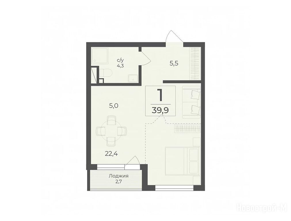 1-комн. апартамент, 42.68 м2, 2 этаж