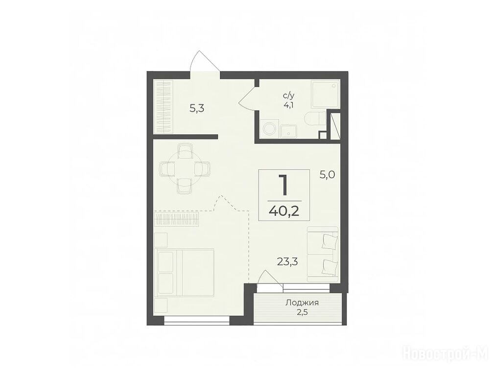 1-комн. апартамент, 42.96 м2, 2 этаж