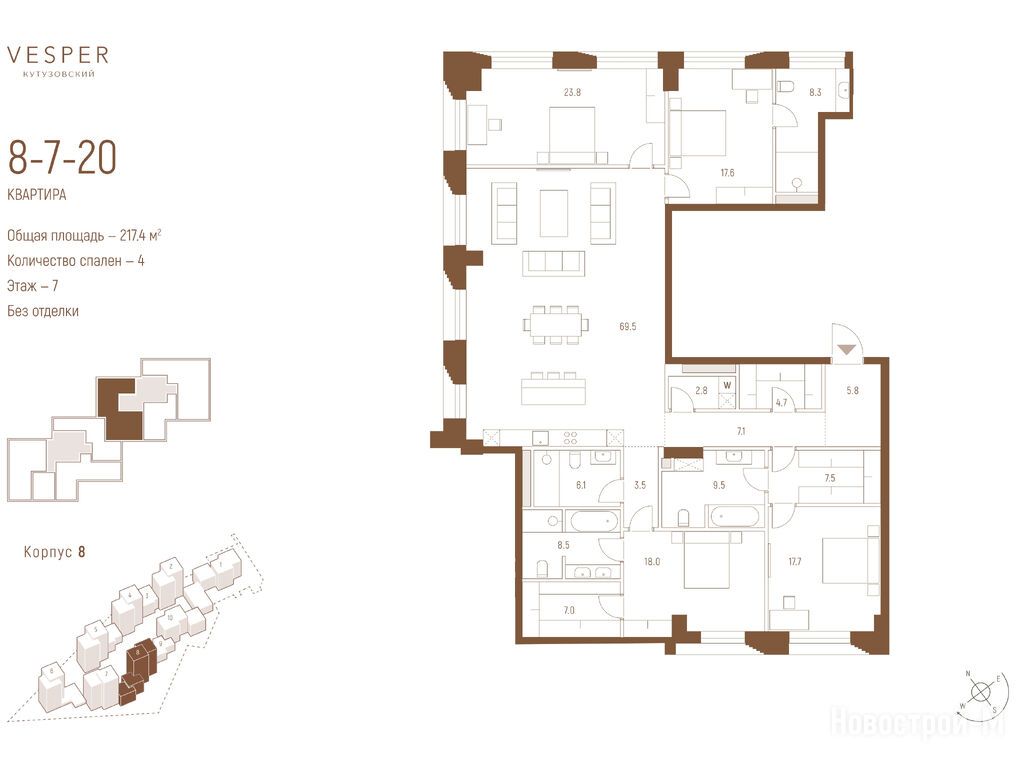 Продается четырехкомнатная квартира в новостройке Квартал Vesper Кутузовский (Веспер Кутузовский) по адресу Москва, ЗАО, Дорогомилово, пр-кт Кутузовский, вл. 12. Общая площадь квартиры - 217.4 кв. м. Тип проекта, по которому построен дом — Монолит, компания-застройщик — ООО СЗ ДИВИНУС ИММОБИЛА, Vesper (Веспер). Стоимость квартиры — 293 250 860 руб. Способы оплаты можно уточнить у продавца. Срок сдачи — 1 квартал 2028. Более подробная информация по телефону.