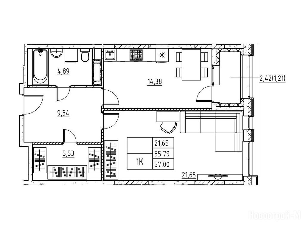 1-комн. квартира, 58.21 м2, 2 этаж