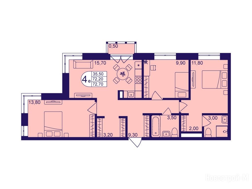 4-комн. квартира, 72.70 м2, 15 этаж