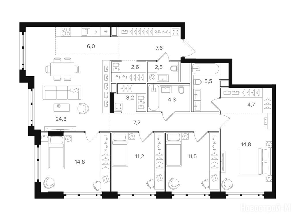 Трешки супер, есть окно в гардеробной, мастер-спальня удалена максимально от всех комнат, кухня-гостиная большая, можно зонировать спокойно. Смутил только длинный коридор-труба на 8 квадратов, пока не очень представляю как это будет выглядеть на деле.