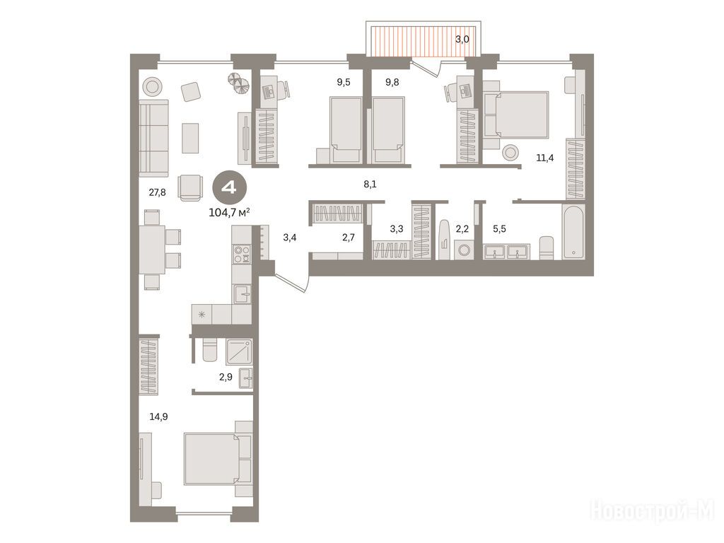 Продается четырехкомнатная квартира в новостройке ЖК «Первый квартал» по адресу Московская область, Ленинский городской округ, Горки Ленинские Г/П, Сапроново деревня, ул. Калиновая, корп. 13. Общая площадь квартиры - 104.7 кв. м. Тип проекта, по которому построен дом — Монолитно-кирпичный, компания-застройщик — Брусника, Третий квартал, ООО Брусника. Стоимость квартиры — 17 510 000 руб. Способы оплаты можно уточнить у продавца. Срок сдачи — 4 квартал 2027. Более подробная информация по телефону.