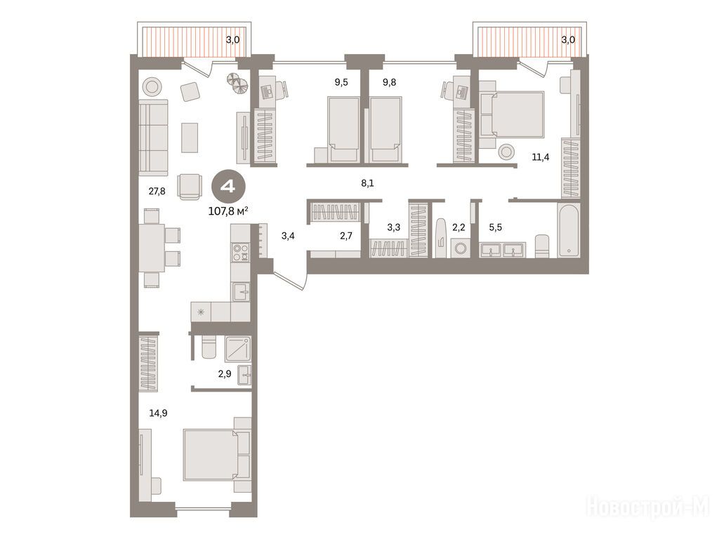 Продается четырехкомнатная квартира в новостройке ЖК «Первый квартал» по адресу Московская область, Ленинский городской округ, Горки Ленинские Г/П, Сапроново деревня, ул. Калиновая, корп. 12. Общая площадь квартиры - 107.8 кв. м. Тип проекта, по которому построен дом — Монолитно-кирпичный, компания-застройщик — Брусника, Третий квартал, ООО Брусника. Стоимость квартиры — 18 900 000 руб. Способы оплаты можно уточнить у продавца. Срок сдачи — 4 квартал 2027. Более подробная информация по телефону.