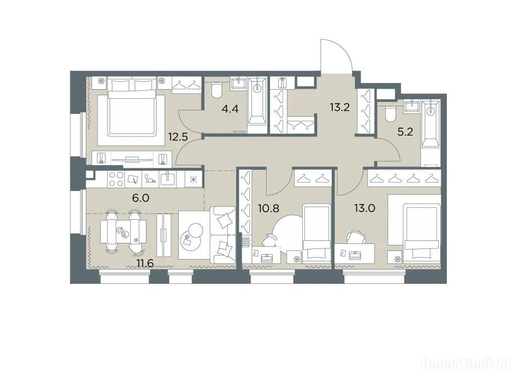 Тут шикарные квартиры - от студий до пятикомнатных пентхаусов, площадь от 28 до 103 кв. м. Во всех квартирах увеличенная площадь остекления, большие кухни, просторные гостиные и продуманные гардеробные. Есть варианты с мастер-спальнями, угловыми окнами и постирочными, а еще квартиры со вторым светом, каминными залами, личными террасами, патио, зимними садами, тремя спальнями и дополнительными санузлами.