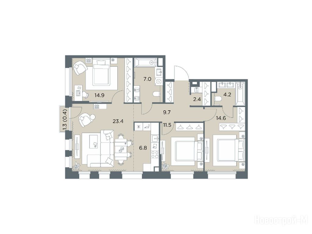 Тут шикарные квартиры - от студий до пятикомнатных пентхаусов, площадь от 28 до 103 кв. м. Во всех квартирах увеличенная площадь остекления, большие кухни, просторные гостиные и продуманные гардеробные. Есть варианты с мастер-спальнями, угловыми окнами и постирочными, а еще квартиры со вторым светом, каминными залами, личными террасами, патио, зимними садами, тремя спальнями и дополнительными санузлами.