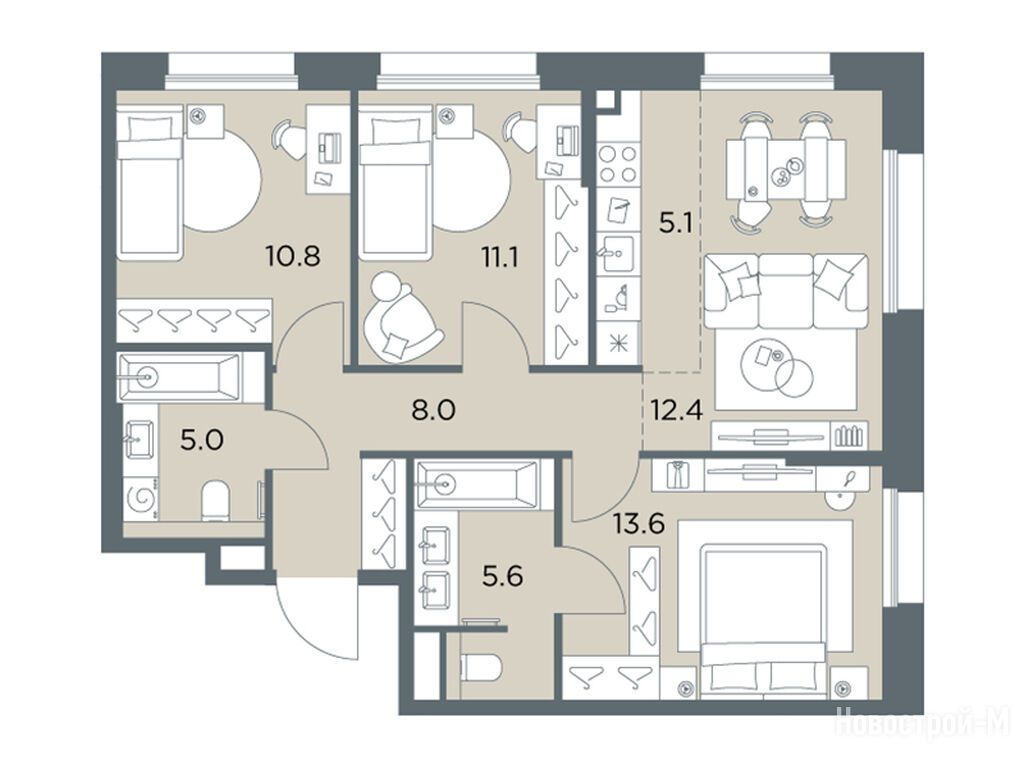 Тут шикарные квартиры - от студий до пятикомнатных пентхаусов, площадь от 28 до 103 кв. м. Во всех квартирах увеличенная площадь остекления, большие кухни, просторные гостиные и продуманные гардеробные. Есть варианты с мастер-спальнями, угловыми окнами и постирочными, а еще квартиры со вторым светом, каминными залами, личными террасами, патио, зимними садами, тремя спальнями и дополнительными санузлами.