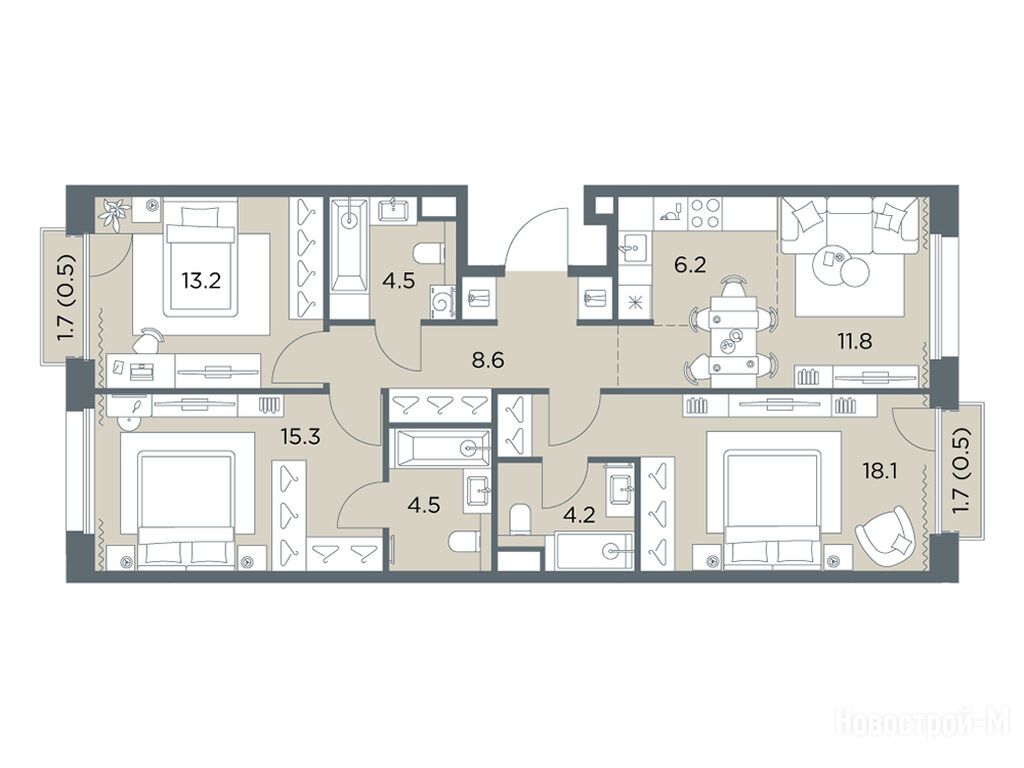Тут шикарные квартиры - от студий до пятикомнатных пентхаусов, площадь от 28 до 103 кв. м. Во всех квартирах увеличенная площадь остекления, большие кухни, просторные гостиные и продуманные гардеробные. Есть варианты с мастер-спальнями, угловыми окнами и постирочными, а еще квартиры со вторым светом, каминными залами, личными террасами, патио, зимними садами, тремя спальнями и дополнительными санузлами.