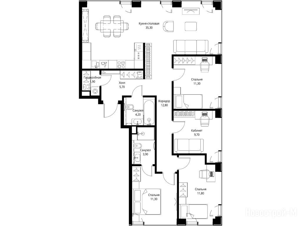 Пространство ощущается благодаря высоте потолков в 2,95 м. Отсутствие балконов, конечно, может расстроить, но панорамные окна во всю стену компенсируют этот недостаток, открывая прекрасный вид и наполняя квартиру светом.