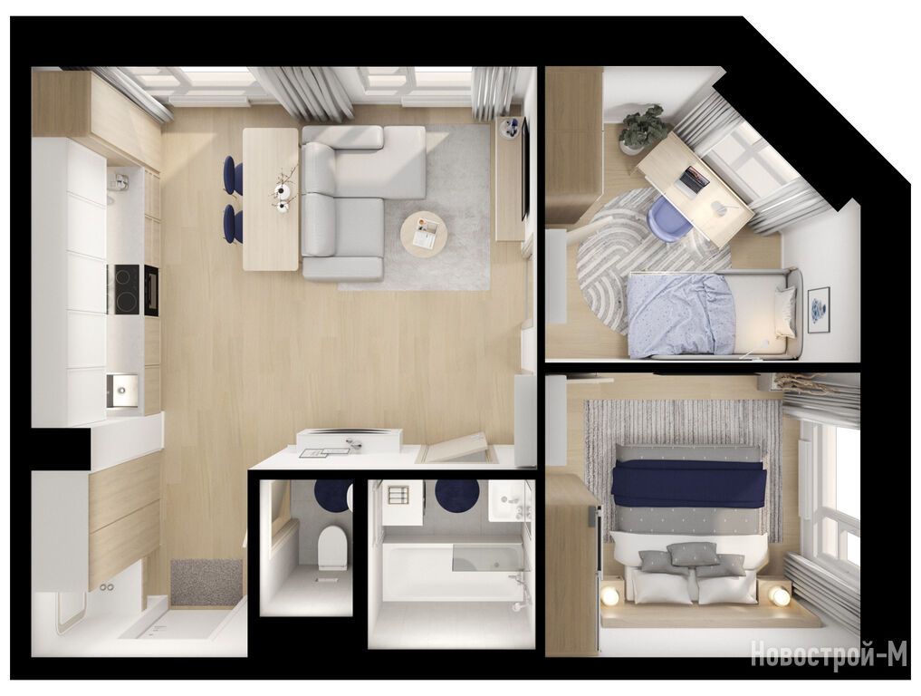 Взяли двушку. Прикольно, что уже на 59 квадратов идут 2 с/у. Сначала смутило, что без балкона, но вообще вместо них кладовые делают. Реально удобно, не надо квартиру хламом нагружать. Поэтому в планах еще кладовку покупать.