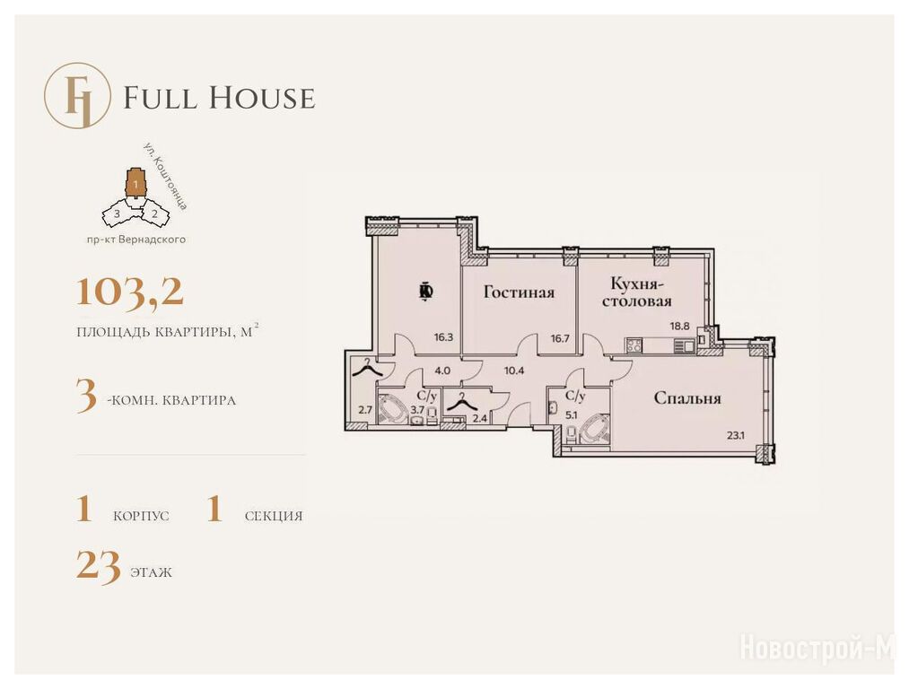 Продается двухкомнатная квартира в новостройке Клубный дом Full House (Фул Хаус) по адресу Москва, ЗАО, Тропарево-Никулино, пр-т Вернадского, у станции метро «Юго-Западная». Общая площадь квартиры - 103.8 кв. м. Тип проекта, по которому построен дом — Монолитно-кирпичный, компания-застройщик — Sezar Group (Сезар Групп), ООО ФИРМА «Илион-Трейд». Стоимость квартиры — 60 723 000 руб. Способы оплаты можно уточнить у продавца. Более подробная информация по телефону.