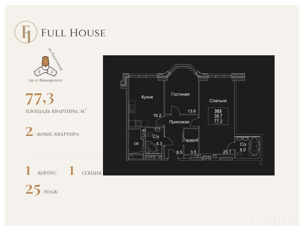 Продается двухкомнатная квартира в новостройке Клубный дом Full House (Фул Хаус) по адресу Москва, ЗАО, Тропарево-Никулино, пр-т Вернадского, у станции метро «Юго-Западная». Общая площадь квартиры - 77.3 кв. м. Тип проекта, по которому построен дом — Монолитно-кирпичный, компания-застройщик — Sezar Group (Сезар Групп), ООО ФИРМА «Илион-Трейд». Стоимость квартиры — 47 539 500 руб. Способы оплаты можно уточнить у продавца. Более подробная информация по телефону.