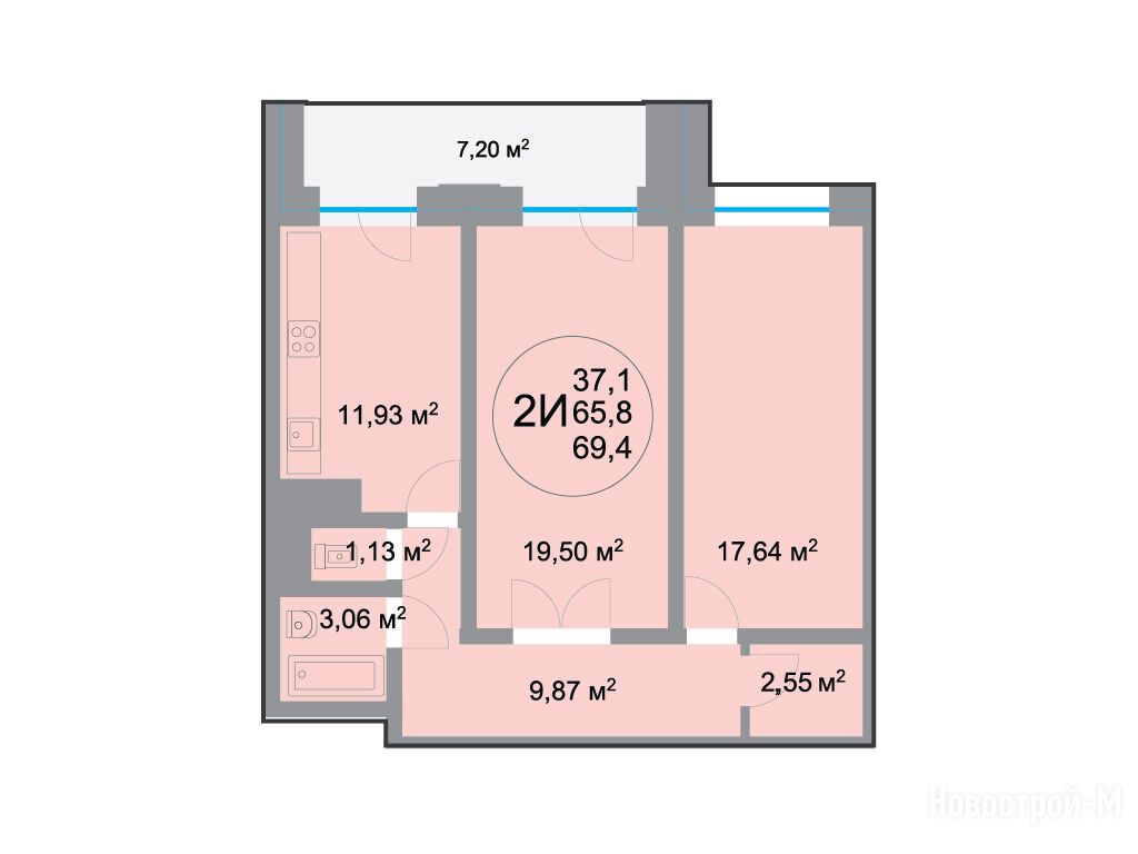 2-комн. квартира, 65.70 м2, 16 этаж