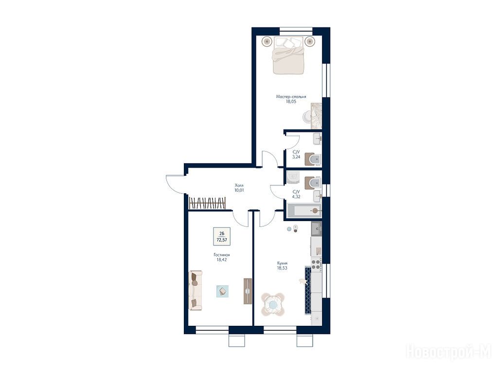2-комн. квартира, 72.57 м2, 4 этаж