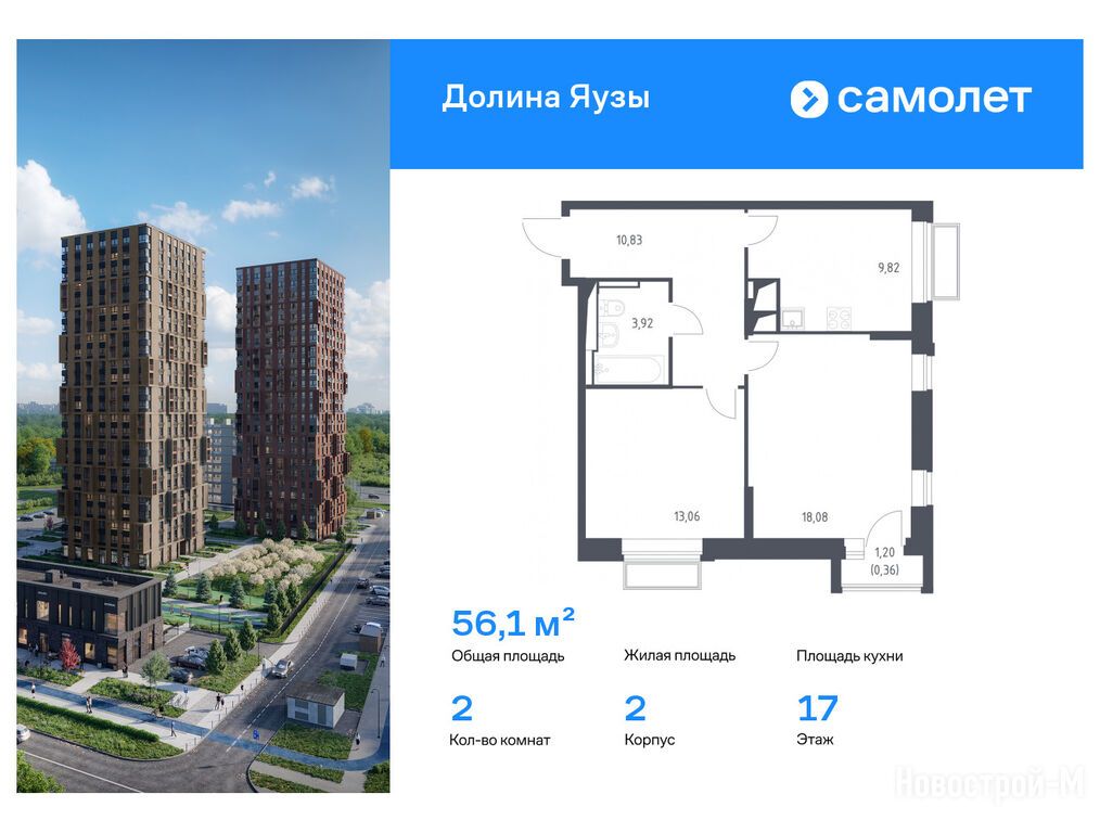 Продается двухкомнатная квартира в новостройке ЖК «Долина Яузы» по адресу Московская область, Мытищи городской округ, Мытищи, мкр.20, ул. Трудовая корп. 2. Общая площадь квартиры - 56.1 кв. м. Тип проекта, по которому построен дом — Монолитно-кирпичный, компания-застройщик — ООО СЗ «Реновация-Мытищи», Группа «Самолет». Стоимость квартиры — 20 370 976 руб. Способы оплаты можно уточнить у продавца. Более подробная информация по телефону.