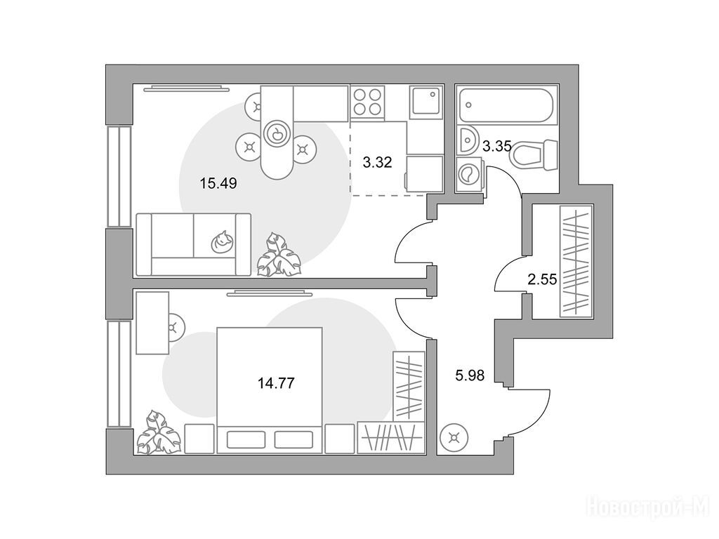 Данная квартира является лидером продаж среди двухкомнатных квартир в ЖК «Ильинойс» по данным Росреестра