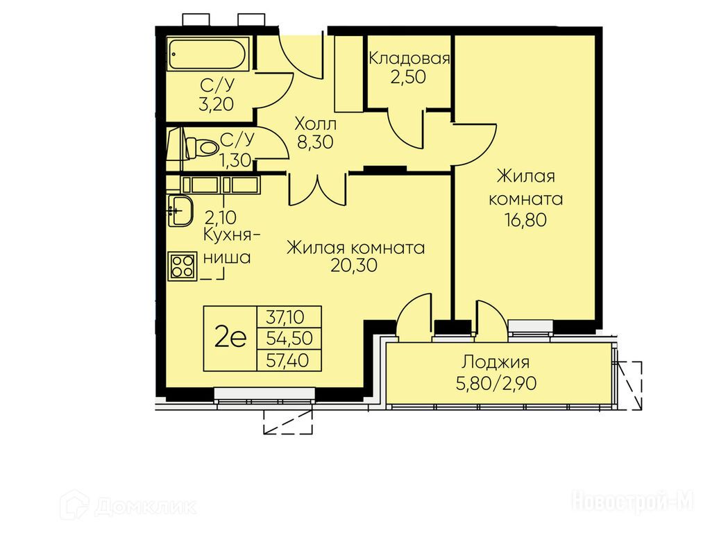 2-комн. квартира, 57.40 м2, 5 этаж