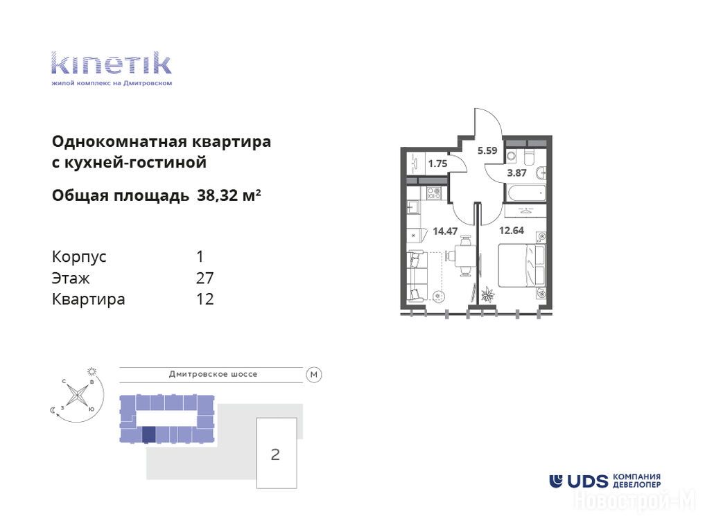 Продается двухкомнатная квартира в новостройке ЖК Kinetik (Кинетик) по адресу Москва, САО, Западное Дегунино, Дмитровское ш., вл. 77. Общая площадь квартиры - 38.32 кв. м. Тип проекта, по которому построен дом — Монолитно-кирпичный, компания-застройщик — ООО «СЗ «СоюзЦМА», ГК UDS. Стоимость квартиры — 19 873 165 руб. Способы оплаты можно уточнить у продавца. Более подробная информация по телефону.