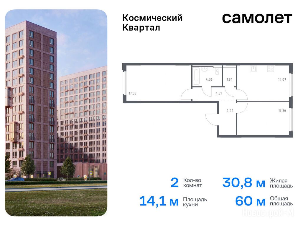 Продается двухкомнатная квартира в новостройке ЖК «Космический квартал» по адресу Московская область, Королев городской округ, Королев, ул. Тихонравова, ул. Лесная, ул. Советская, д. 1. Общая площадь квартиры - 60.03 кв. м. Тип проекта, по которому построен дом — Монолит,Железобетон, компания-застройщик — Группа «Самолет», ООО СЗ Самолет-Королев. Стоимость квартиры — 14 982 040 руб. Способы оплаты можно уточнить у продавца. Срок сдачи — 4 квартал 2026. Более подробная информация по телефону.
