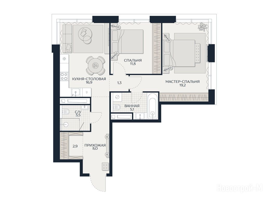 2-комн. квартира, 68.70 м2, 8 этаж