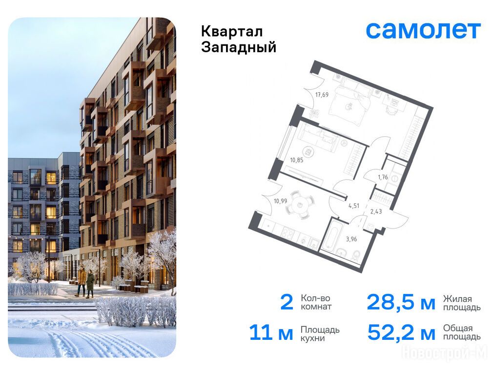 Продается двухкомнатная квартира в новостройке ЖК «Квартал Западный» по адресу Москва, ТиНАО, Новомосковский АО, Марушкинское С/П, ЖК «Квартал Западный», корп.9. Общая площадь квартиры - 52.19 кв. м. Тип проекта, по которому построен дом — Монолитно-кирпичный, компания-застройщик — ООО CЗ «Самолет-Квартал Западный», Группа «Самолет». Стоимость квартиры — 15 191 397 руб. Способы оплаты можно уточнить у продавца. Срок сдачи — 3 квартал 2026. Более подробная информация по телефону.