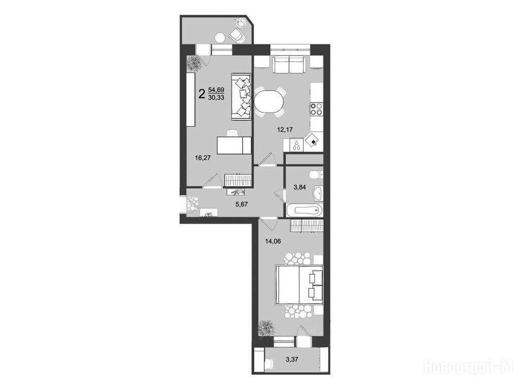 2-комн. квартира, 54.69 м2, 2 этаж