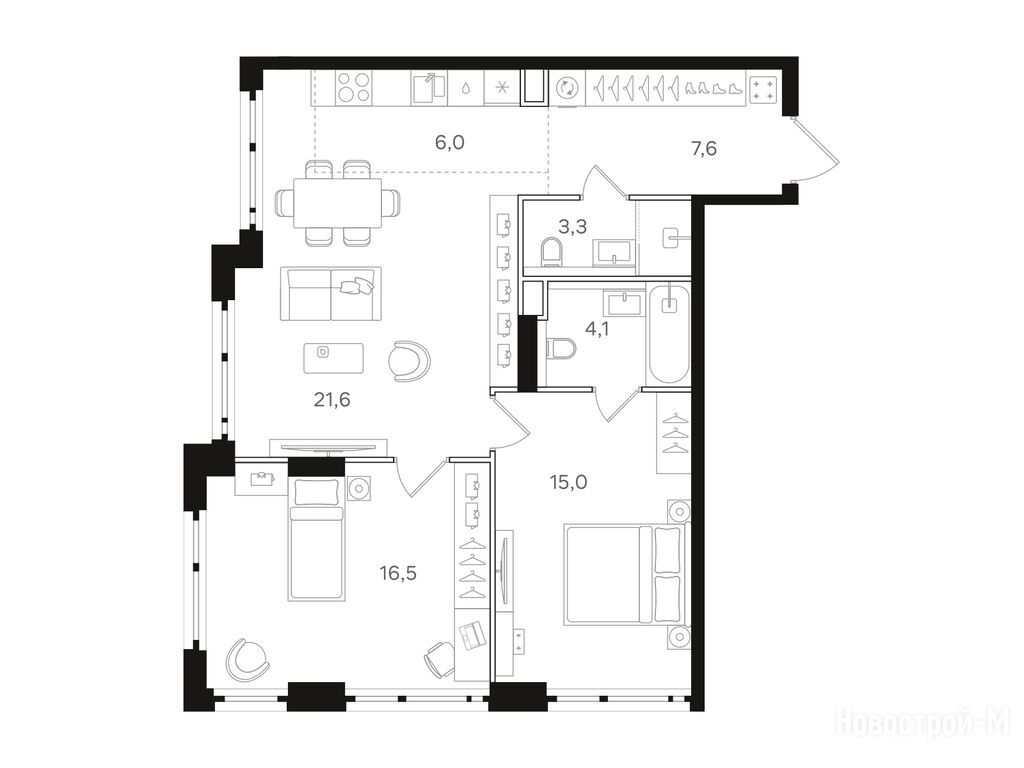 Трешки супер, есть окно в гардеробной, мастер-спальня удалена максимально от всех комнат, кухня-гостиная большая, можно зонировать спокойно. Смутил только длинный коридор-труба на 8 квадратов, пока не очень представляю как это будет выглядеть на деле.