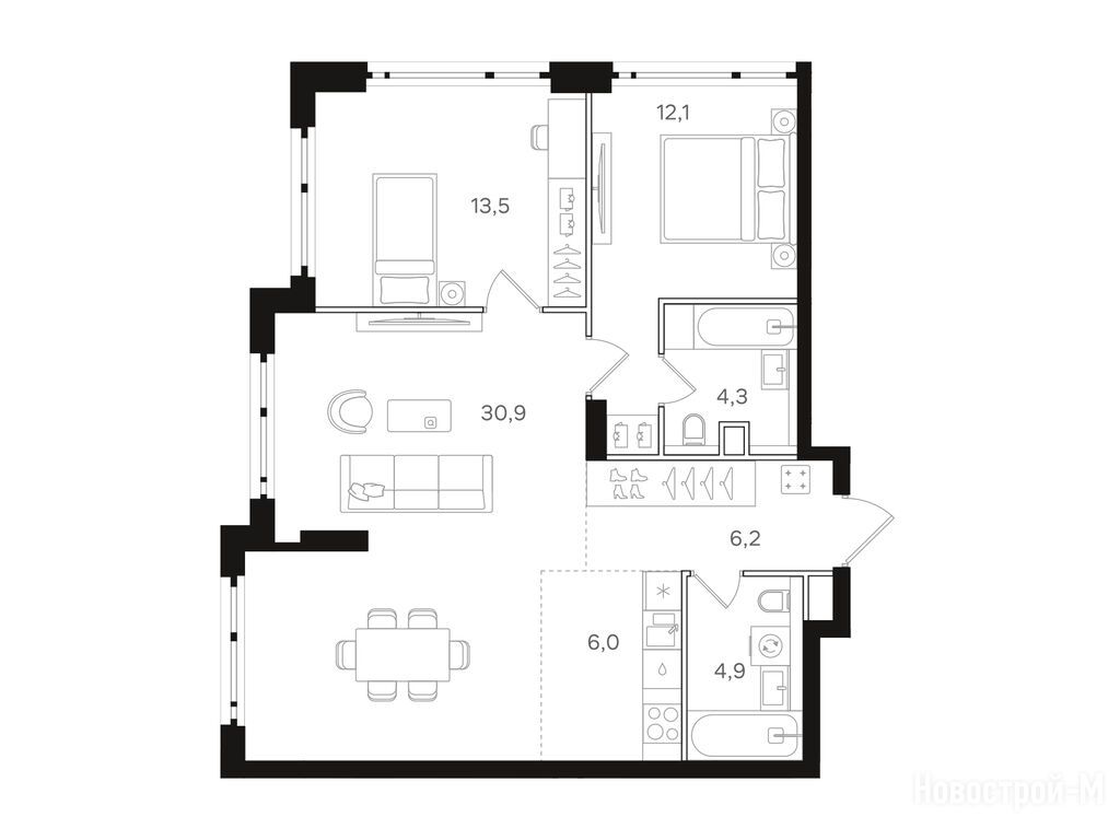 Трешки супер, есть окно в гардеробной, мастер-спальня удалена максимально от всех комнат, кухня-гостиная большая, можно зонировать спокойно. Смутил только длинный коридор-труба на 8 квадратов, пока не очень представляю как это будет выглядеть на деле.