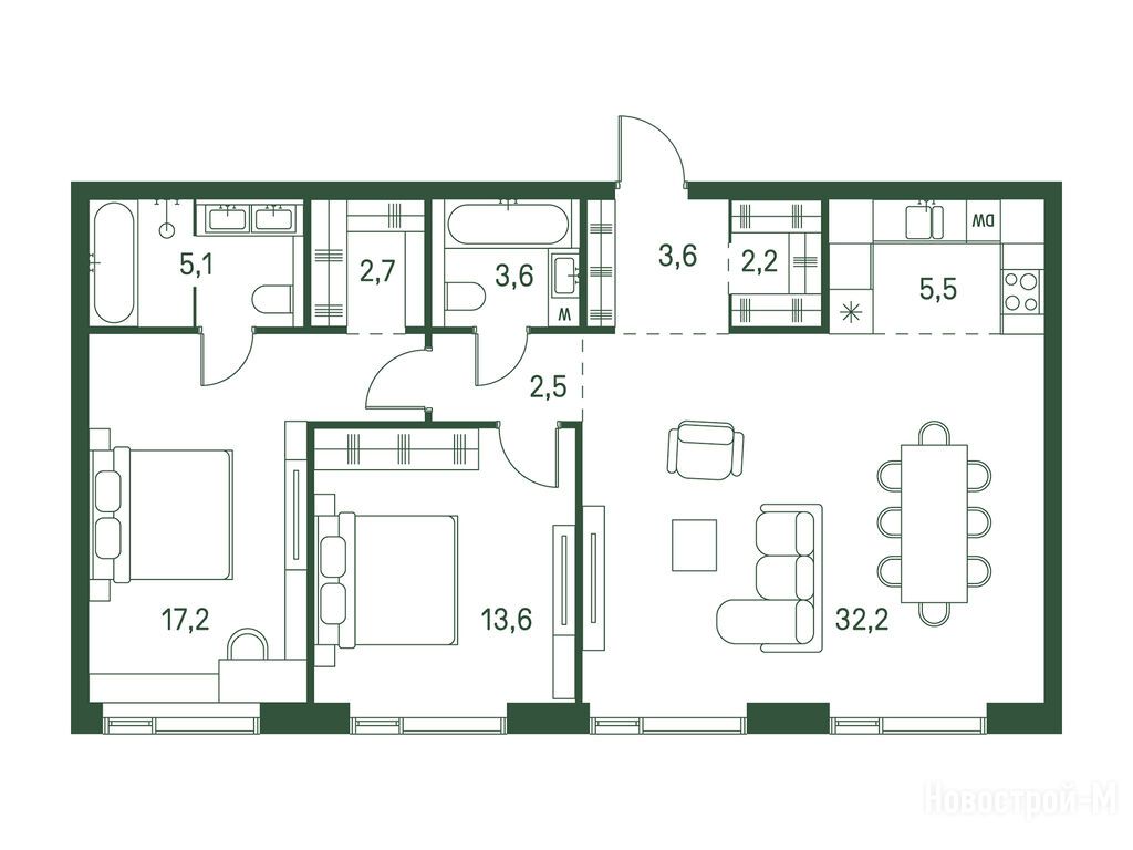 2. полноценная ванная комната,
