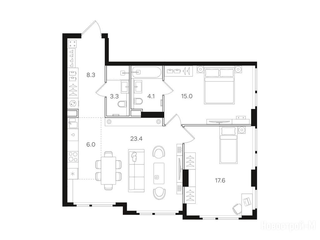 Трешки супер, есть окно в гардеробной, мастер-спальня удалена максимально от всех комнат, кухня-гостиная большая, можно зонировать спокойно. Смутил только длинный коридор-труба на 8 квадратов, пока не очень представляю как это будет выглядеть на деле.