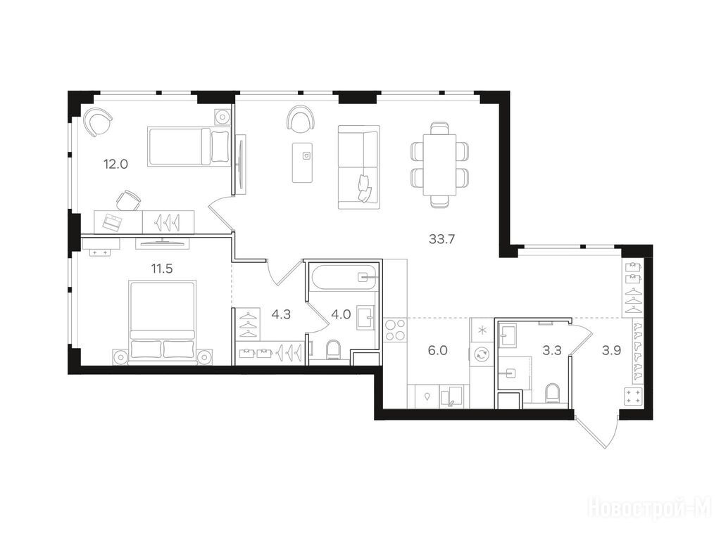 Трешки супер, есть окно в гардеробной, мастер-спальня удалена максимально от всех комнат, кухня-гостиная большая, можно зонировать спокойно. Смутил только длинный коридор-труба на 8 квадратов, пока не очень представляю как это будет выглядеть на деле.