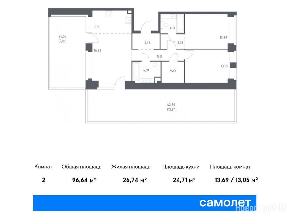 Продается двухкомнатная квартира в новостройке ЖК NOVA (Нова) по адресу Москва, ЗАО, Раменки, ул. Братьев Фонченко, влд. 19. Общая площадь квартиры - 96.64 кв. м. Тип проекта, по которому построен дом — Монолитно-кирпичный, компания-застройщик — Группа «Самолет», ООО СЗ «Сетунь АЛГ». Стоимость квартиры — 103 761 208 руб. Способы оплаты можно уточнить у продавца. Срок сдачи — 4 квартал 2027. Более подробная информация по телефону.