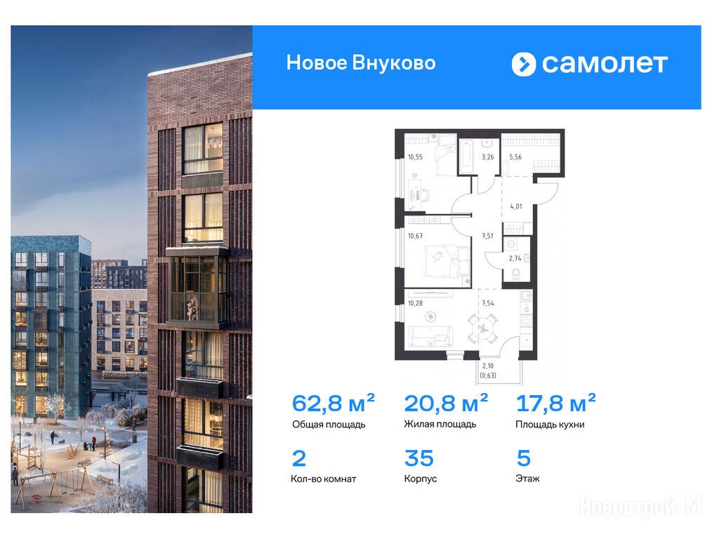 Продается двухкомнатная квартира в новостройке ЖК «Новое Внуково» по адресу Москва, ТиНАО, Новомосковский АО, Кокошкино С/П, Кокошкино пос., д. Санино, корп. 35. Общая площадь квартиры - 62.75 кв. м. Тип проекта, по которому построен дом — Монолитно-кирпичный, компания-застройщик — ООО СЗ «Санино 1», Группа «Самолет». Стоимость квартиры — 16 016 122 руб. Способы оплаты можно уточнить у продавца. Срок сдачи — 4 квартал 2027. Более подробная информация по телефону.