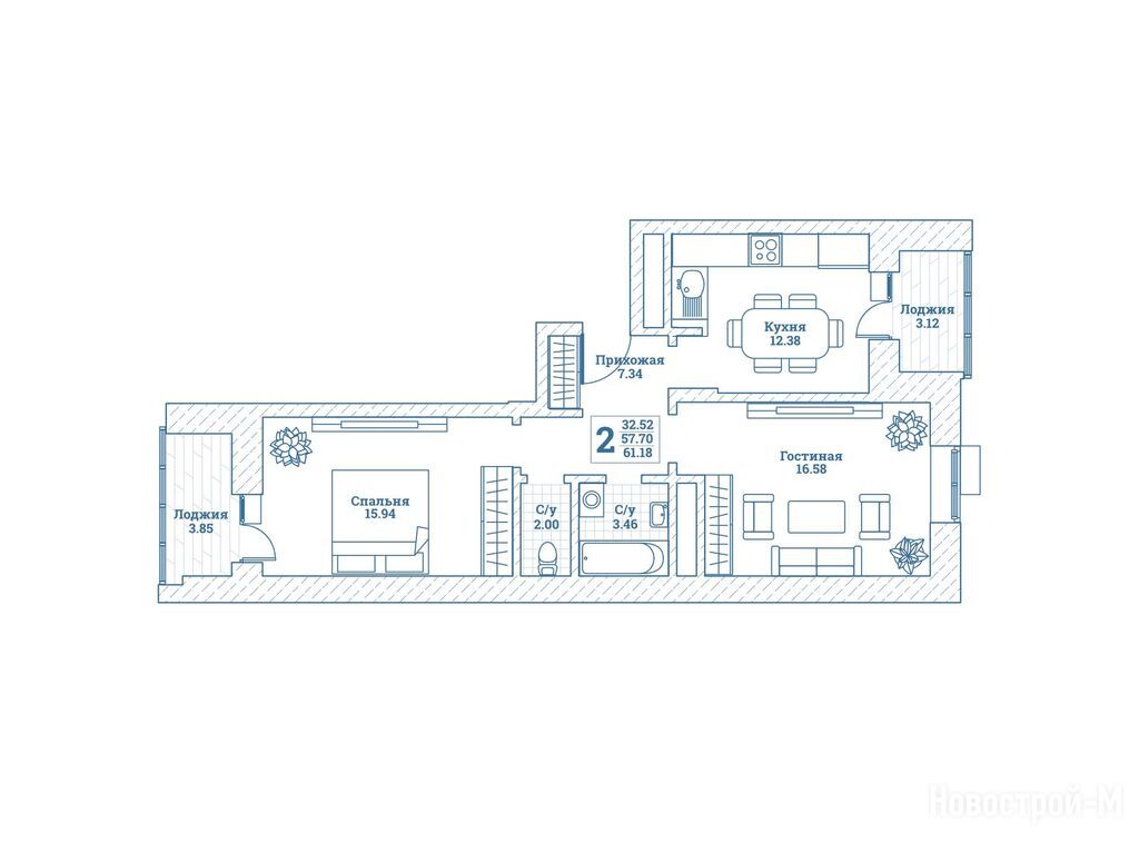 2-комн. квартира, 61.60 м2, 3 этаж