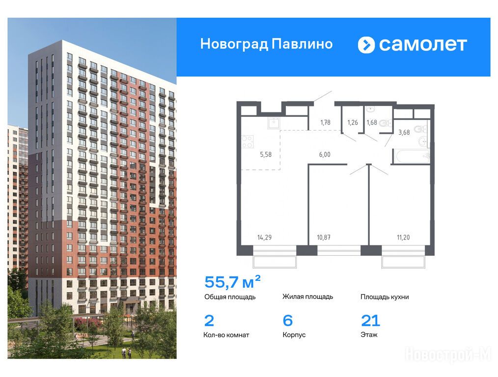 Продается двухкомнатная квартира в новостройке ЖК «Новоград Павлино» по адресу Московская область, Балашиха городской округ, Балашиха, ул. Бояринова, д. 1. Общая площадь квартиры - 55.7 кв. м. Тип проекта, по которому построен дом — Монолитно-кирпичный, компания-застройщик — Группа «Самолет», ООО СЗ «МИЦ-Инвестрой». Стоимость квартиры — 11 486 008 руб. Способы оплаты можно уточнить у продавца. Более подробная информация по телефону.
