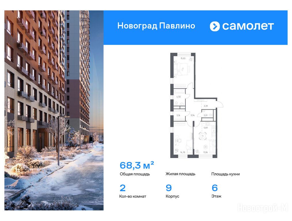 Продается двухкомнатная квартира в новостройке ЖК «Новоград Павлино» по адресу Московская область, Балашиха городской округ, Балашиха, мкр. Новое Павлино, корп. 9. Общая площадь квартиры - 68.3 кв. м. Тип проекта, по которому построен дом — Монолитно-кирпичный, компания-застройщик — Группа «Самолет», ООО СЗ «МИЦ-Инвестрой». Стоимость квартиры — 14 654 653 руб. Способы оплаты можно уточнить у продавца. Более подробная информация по телефону.
