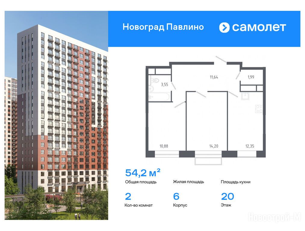 Продается двухкомнатная квартира в новостройке ЖК «Новоград Павлино» по адресу Московская область, Балашиха городской округ, Балашиха, ул. Бояринова, д. 1. Общая площадь квартиры - 54.2 кв. м. Тип проекта, по которому построен дом — Монолитно-кирпичный, компания-застройщик — Группа «Самолет», ООО СЗ «МИЦ-Инвестрой». Стоимость квартиры — 11 076 095 руб. Способы оплаты можно уточнить у продавца. Более подробная информация по телефону.