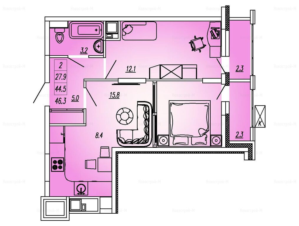 2-комн. квартира, 46.60 м2, 3 этаж