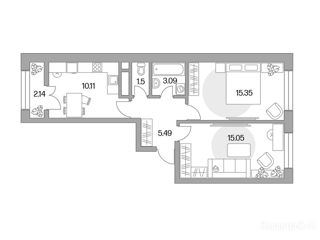 Данная квартира является лидером продаж среди двухкомнатных квартир в ЖК «Пехра» по данным Росреестра