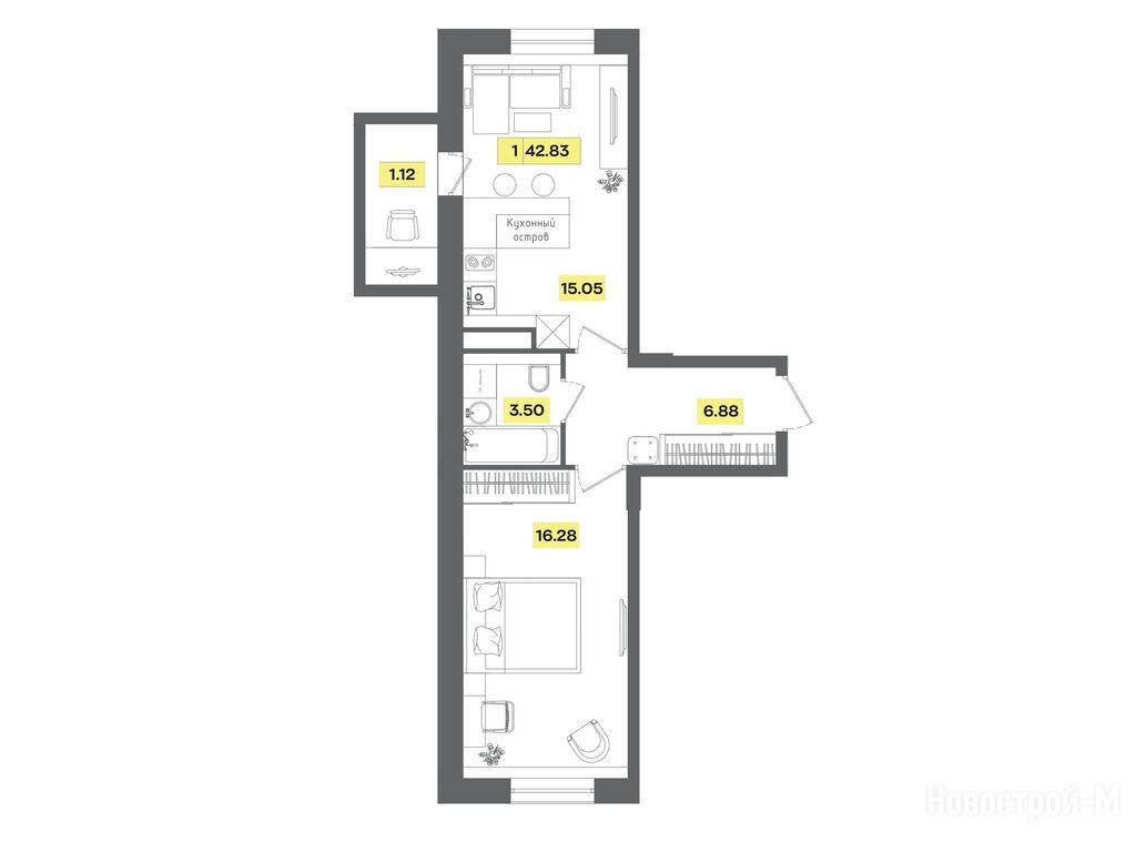 2-комн. квартира, 42.83 м2, 5 этаж