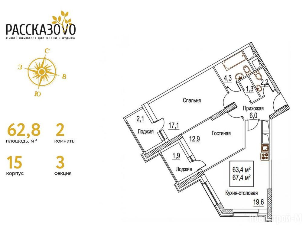Продается двухкомнатная квартира в новостройке ЖК «Рассказово» по адресу Москва, ТиНАО, Новомосковский АО, Внуковское С/П, Рассказовка деревня, бульвар Андрея Тарковского, д. 10. Общая площадь квартиры - 67.9 кв. м. Тип проекта, по которому построен дом — Монолитно-кирпичный, компания-застройщик — Sezar Group (Сезар Групп). Стоимость квартиры — 22 950 200 руб. Способы оплаты можно уточнить у продавца. Более подробная информация по телефону.