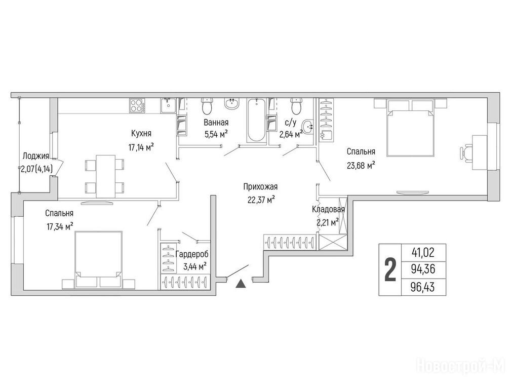 2-комн. квартира, 96.43 м2, 8 этаж