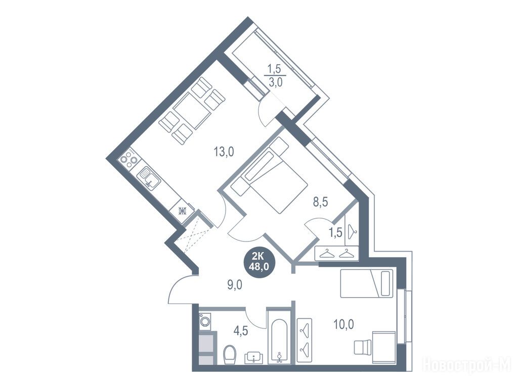 2-комн. квартира, 48.00 м2, 13 этаж