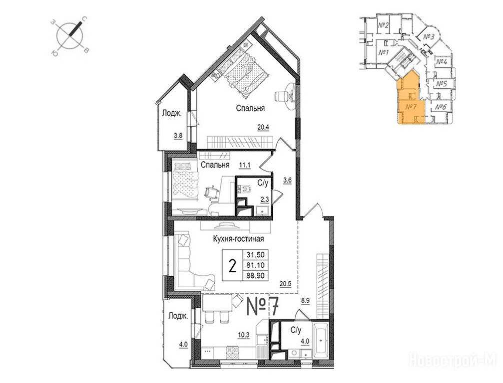 Расположение 2-комн. квартиры