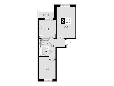 2-комн. квартира, 60.70 м2, 2 этаж