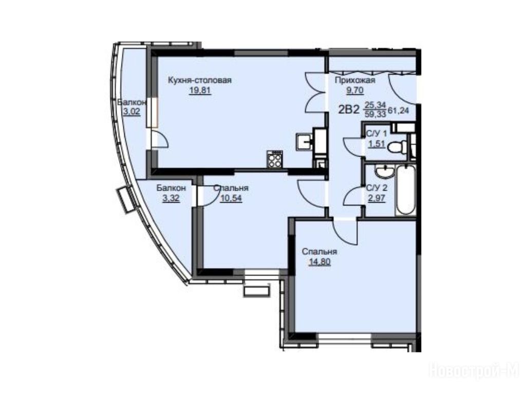 2-комн. квартира, 62.00 м2, 14 этаж