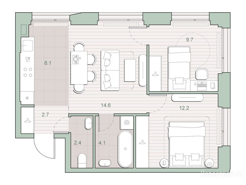 Полноценный жк бизнес-класса. Подземный паркинг, закрытый двор, вся необходимая инфраструктура в самом комплексе либо в двух шагах от дома.