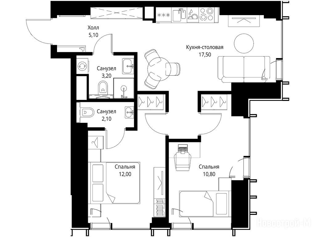 Пространство ощущается благодаря высоте потолков в 2,95 м. Отсутствие балконов, конечно, может расстроить, но панорамные окна во всю стену компенсируют этот недостаток, открывая прекрасный вид и наполняя квартиру светом.