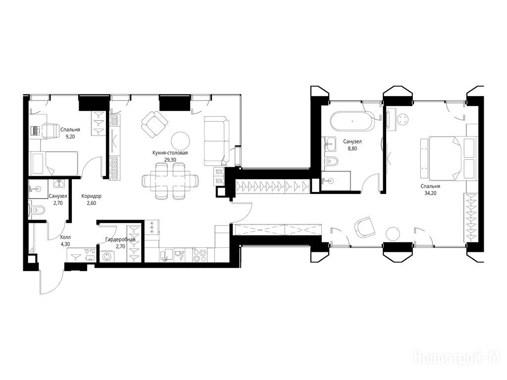 Пространство ощущается благодаря высоте потолков в 2,95 м. Отсутствие балконов, конечно, может расстроить, но панорамные окна во всю стену компенсируют этот недостаток, открывая прекрасный вид и наполняя квартиру светом.