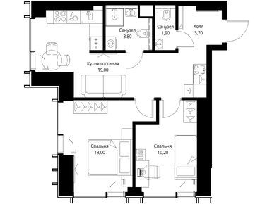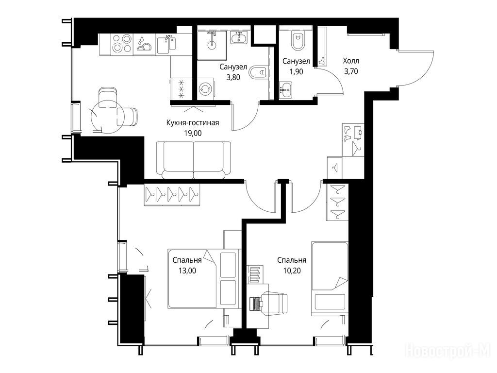 Пространство ощущается благодаря высоте потолков в 2,95 м. Отсутствие балконов, конечно, может расстроить, но панорамные окна во всю стену компенсируют этот недостаток, открывая прекрасный вид и наполняя квартиру светом.